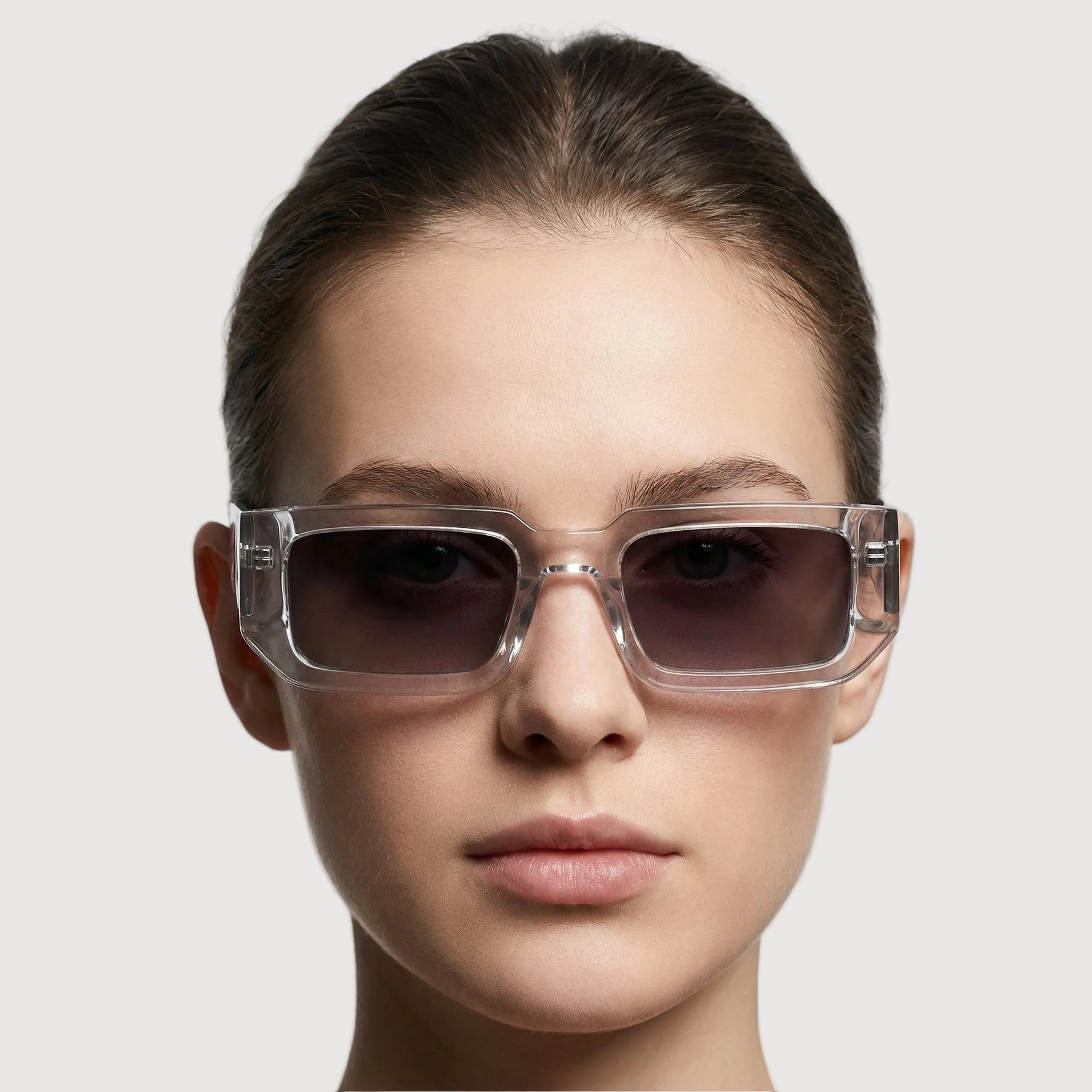 Galaxsos Midnight – Frontansicht der transparenten Unisexbrille in Silber mit eckigem Design. Galaxsos Midnight – Frontansicht der transparenten Unisexbrille in Silber mit eckigem Design.