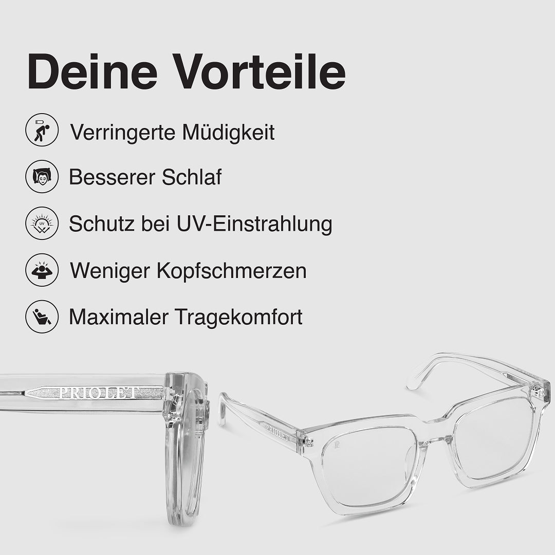 Alle unsere Brillen sind mit einem integrierten Blaulichtfilter ausgestattet, der deine Augen zuverlässig vor digitaler Belastung schützt.